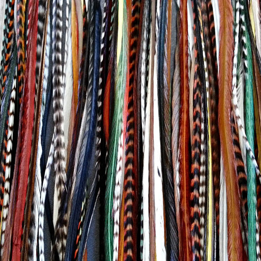 The possibilities are truly endless, so you can create the perfect custom look for yourself or as a gift. Choose from grizzly striped or non-grizzly striped feathers and select your preferred length from 10 inches to very long over 16 inches. With each feather selected by you, you can create a design that's truly one of a kind and adds a pop of color and texture to your hair.