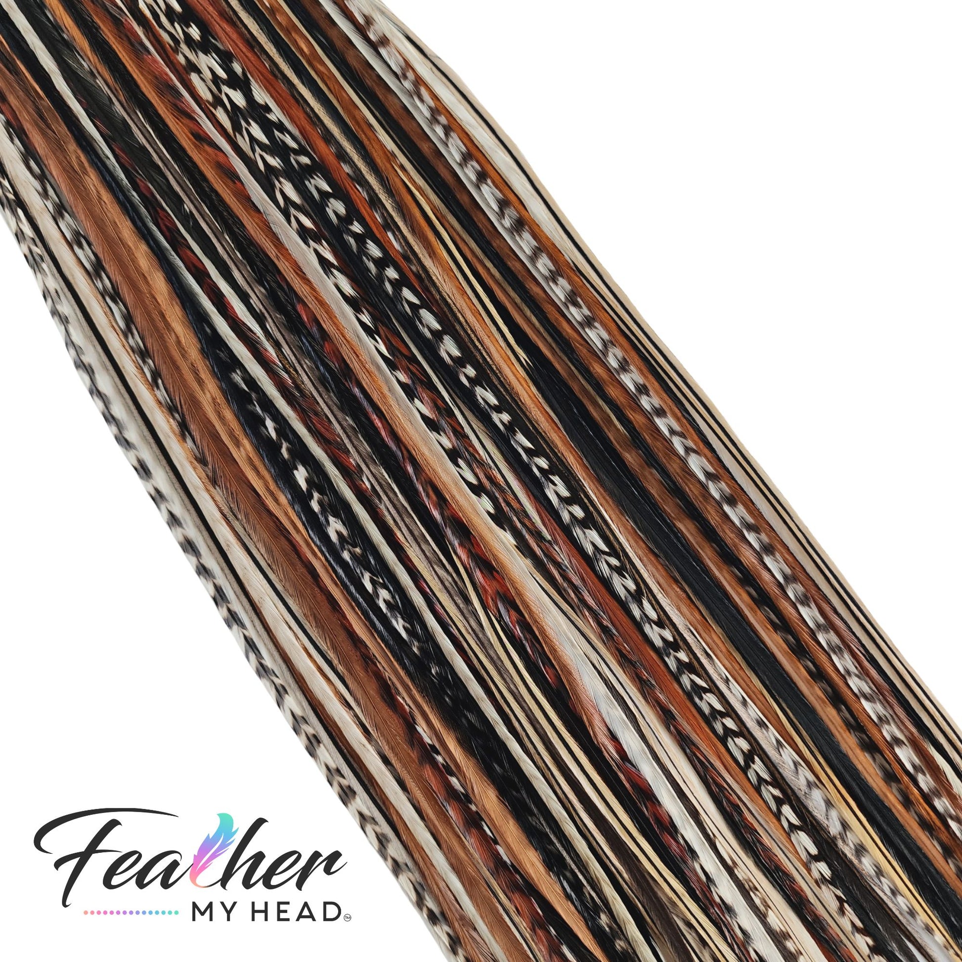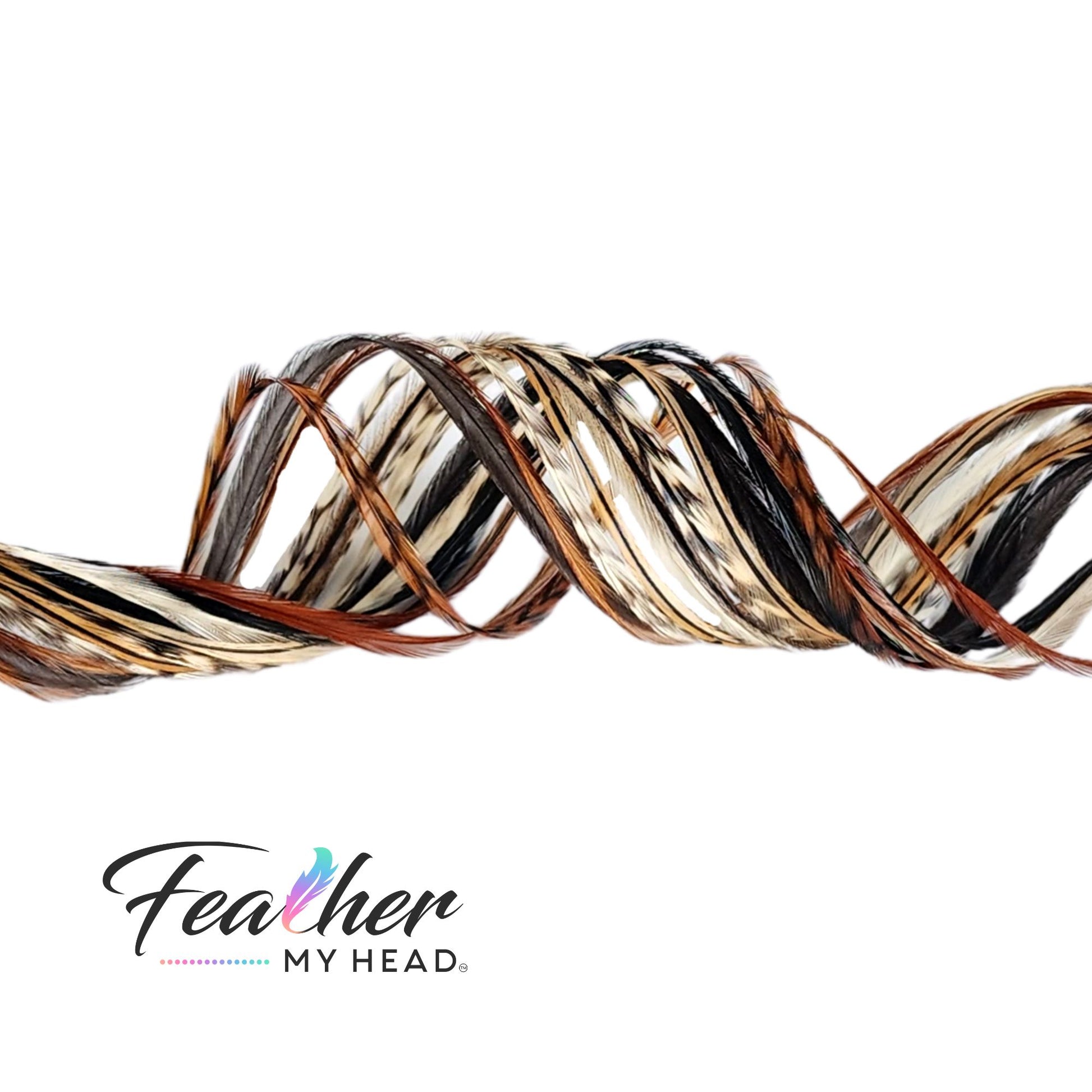 Experience a rich mix of natural rooster feathers featuring stunning grizzly patterns, dunn grizzly, solid black, silver badge, warm medium and ginger browns, plus soft cream tones. This bundle set offers 6 or 16 salon-quality feathers that add earthy, textured beauty to any hairstyle. Perfect for DIY styling or salon use, these heat-resistant feathers blend seamlessly for a natural, boho-chic look.