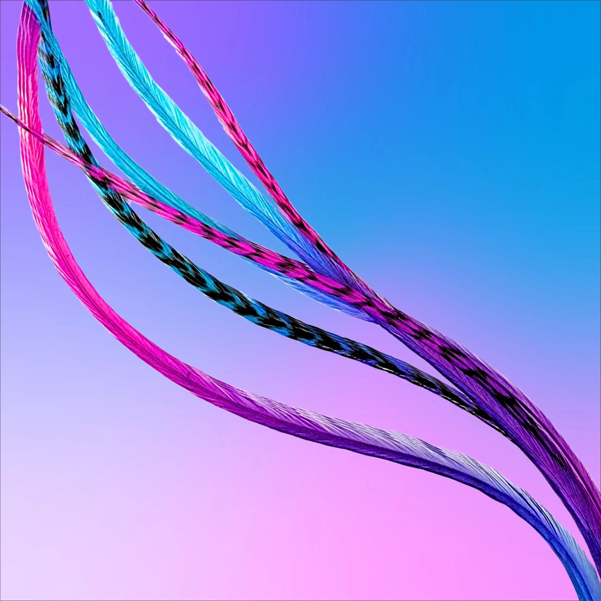 Brighten your style with a lively mix of pink, purple, blue, and turquoise feathers in a stunning rainbow tie dye pattern. Each feather is crafted from premium real rooster feathers that are soft, flexible, and heat-resistant—perfect for adding a splash of color and texture to any hairstyle.